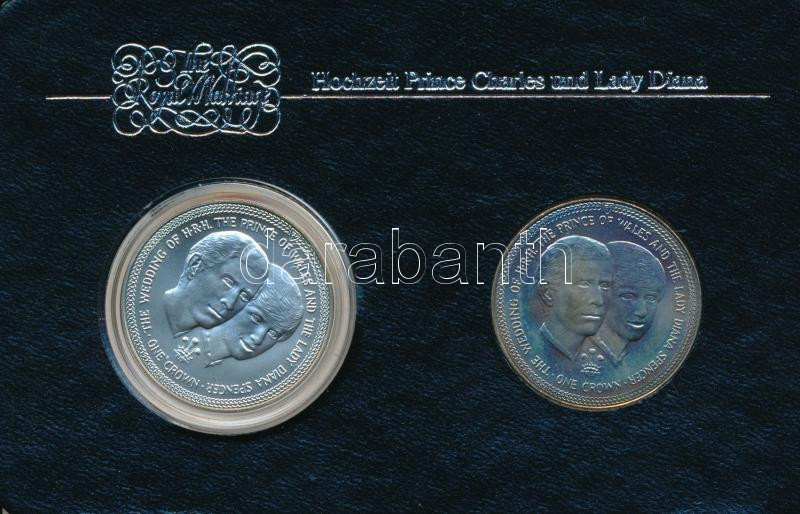 Isle of Man 1981. 1 Crown (2xdiff) Ag + Cu-Ni "Royal Wedding" coin pair in plastic and foil case, with German description C:AU, small patina, foil error, Ag: PP in capsule