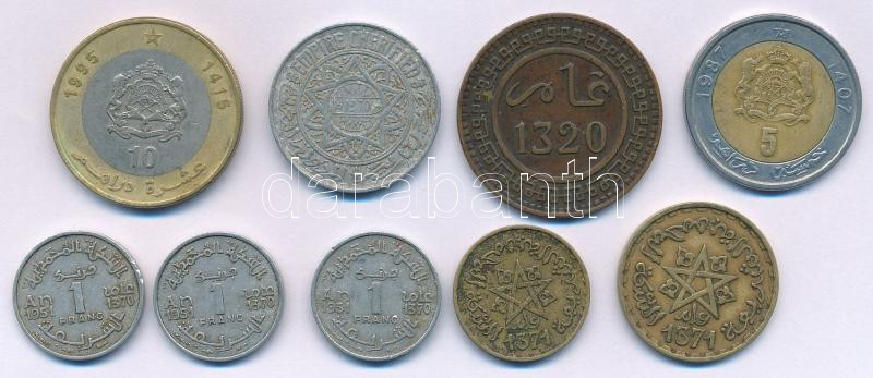 Marokkó 1320(1903) 10M bronz "Abd al-Aziz" + 1370-1415(1950-1995) 1Fr - 10D (6xklf,8db) T:VF, patina