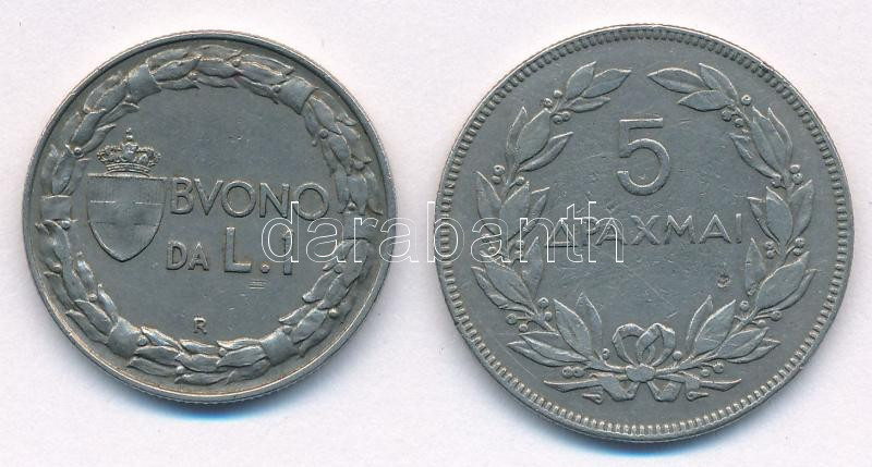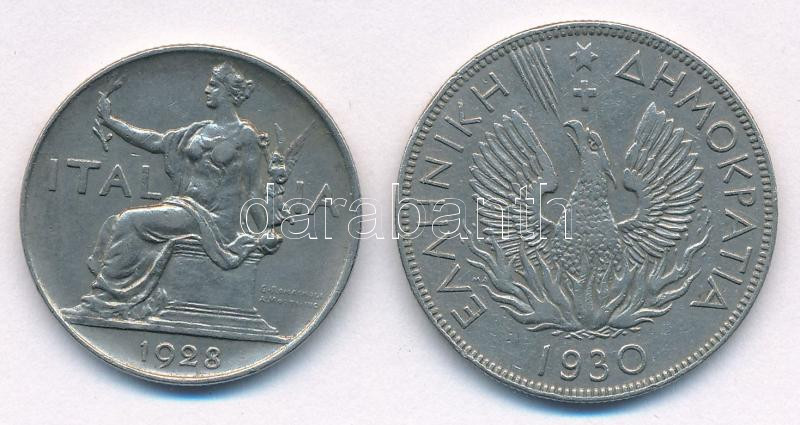 Olaszország 1928R 1L Ni + Görögország 1930. 5D Ni T:AU,XF Italy 1928R 1 Lira Ni + Greece 1930. 5 Drachmai Ni C:AU,XF Krause KM#71.1, KM#62