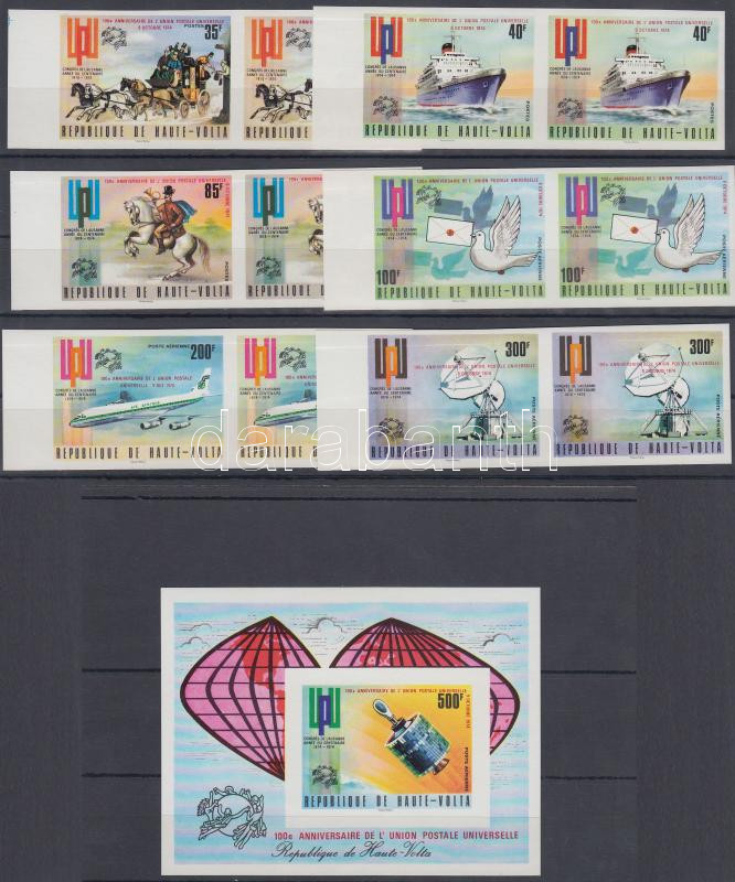 1974 100 éves az UPU felülnyomott sor vágott ívszéli párokban Mi 532-537 + vágott blokk 28