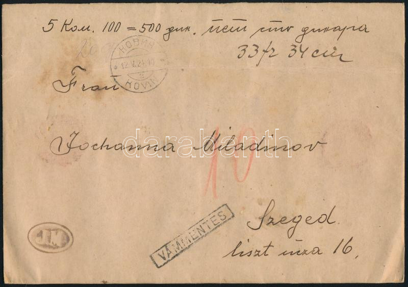 Beschreibung: 1924 Értéklevél Szegedre kétnyelvű "KOVIN" bélyegzéssel
