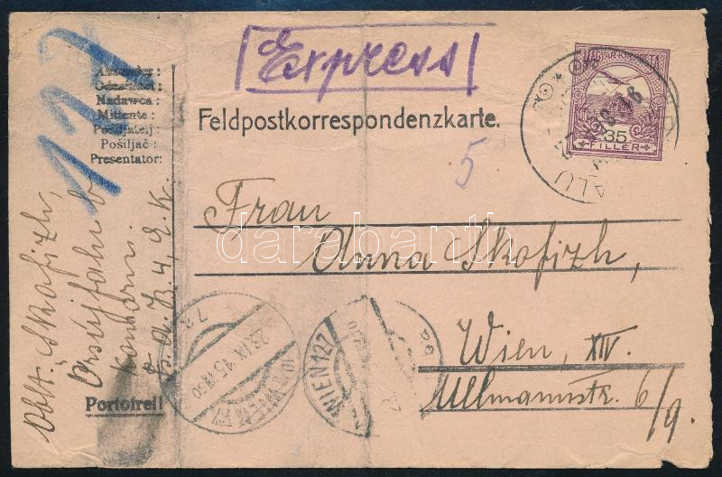 Beschreibung: 1915 Expressz levelezőlap Turul 35f bérmentesítéssel Örsújfaluról Bécsbe
