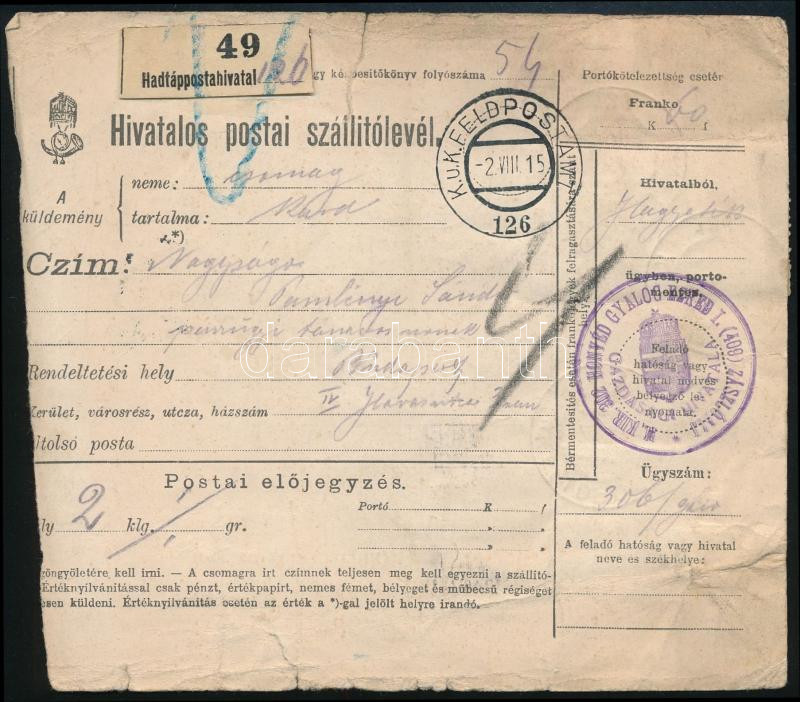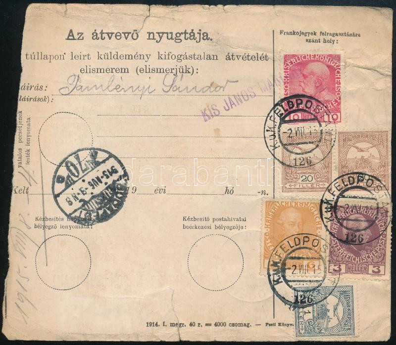 Beschreibung: 1915 Hivatalos postai szállítólevél magyar-osztrák begyes bérmentesítéssel / Official parcel card with Hungarian-Austrian mixed franking "K.u.K. FELDPOST 126"