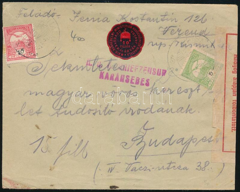 Beschreibung: ~1916 Cenzúrázott levél Turul 10f + 5f bérmentesítéssel, segélybélyeggel "K.u.k. BRIEFZENSUR KARÁNSEBES"