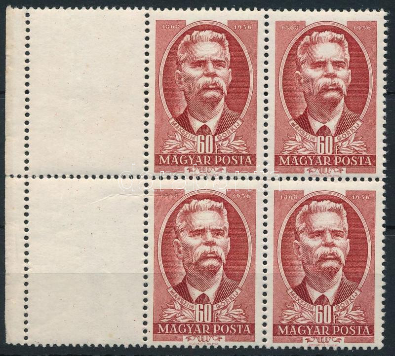 1951 Maxim Gorkij 60f négyestömb bal oldalon üres mezővel (6.000) https://www.darabanth.com/de/514-Auktion-Philatelie-Postkarten-Numismatik-Kunstwerke-Bucher-Schreibwaren-Schmuck/515.0/Philatelie-und-Postgeschichte-Ungarn/Ausgaben-1946-1956~57/1951-Maxim-Gorkij-60f-negyestomb-bal-oldalon-ures-mezovel-6000~II3480320