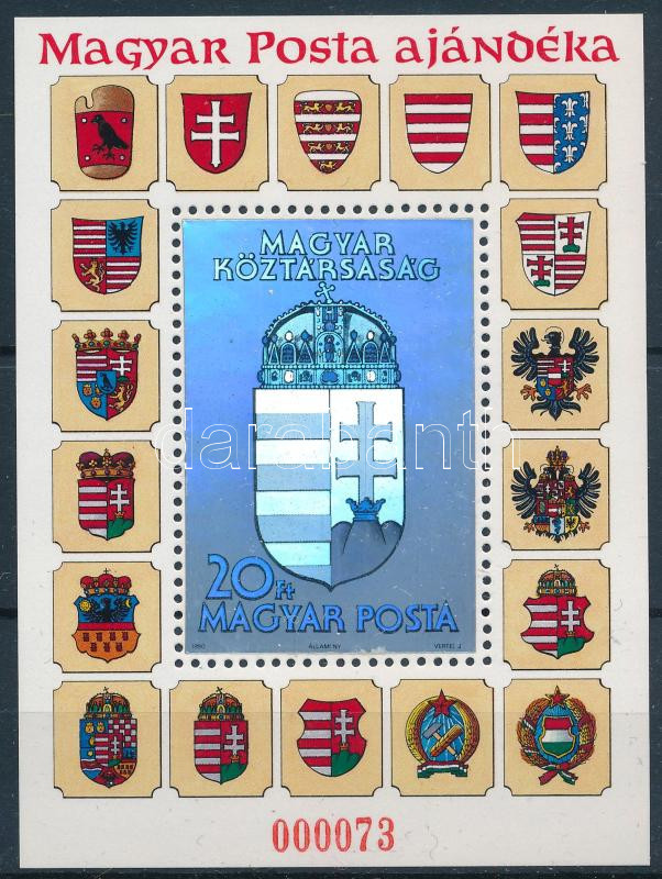 1991 A Magyar Köztársaság címere II. hologramos blokk ajándék változat... https://www.darabanth.com/de/514-Auktion-Philatelie-Postkarten-Numismatik-Kunstwerke-Bucher-Schreibwaren-Schmuck/515.0/Philatelie-und-Postgeschichte-Ungarn/Ausgaben-1990-1999~63/1991-A-Magyar-Koztarsasag-cimere-II-hologramos-blokk-ajandek-valtozat-73-as-sorszammal~II3482967