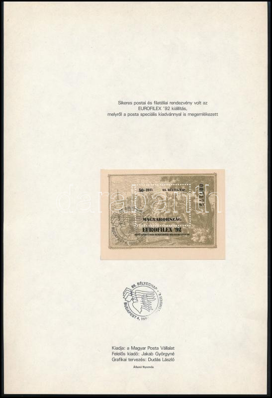 1992 Bélyegnap (65.) - Eurofilex blokk "A MAGYAR POSTA AJÁNDÉKA&q... https://www.darabanth.com/de/514-Auktion-Philatelie-Postkarten-Numismatik-Kunstwerke-Bucher-Schreibwaren-Schmuck/515.0/Philatelie-und-Postgeschichte-Ungarn/Ausgaben-1990-1999~63/1992-Belyegnap-65-Eurofilex-blokk-A-MAGYAR-POSTA-AJANDEKA-emleklapon~II3423814
