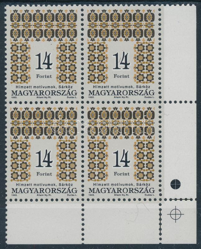 Beschreibung: 1995 Magyar Népművészet 14Ft ívsarki négyestömb, ívszéli jelzéssel / Mi 4336 corner block of 4, sign on the margin