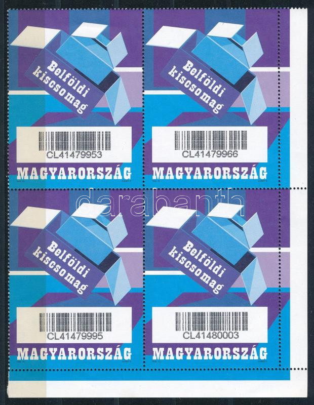 1998 Belföldi kiscsomag bélyeg ívsarki 4-es tömb, összefüggésben ritka... https://www.darabanth.com/de/514-Auktion-Philatelie-Postkarten-Numismatik-Kunstwerke-Bucher-Schreibwaren-Schmuck/515.0/Philatelie-und-Postgeschichte-Ungarn/Ausgaben-1990-1999~63/1998-Belfoldi-kiscsomag-belyeg-ivsarki-4-es-tomb-osszefuggesben-ritka~II3423756