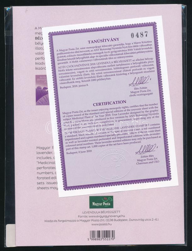 2018 Az év gyógynövénye: Valódi levendula bélyegszett bontatlan csomag... https://www.darabanth.com/de/514-Auktion-Philatelie-Postkarten-Numismatik-Kunstwerke-Bucher-Schreibwaren-Schmuck/515.0/Philatelie-und-Postgeschichte-Ungarn/Ausgaben-2010-2019~65/2018-Az-ev-gyogynovenye-Valodi-levendula-belyegszett-bontatlan-csomagolasban-tanusitvann~II3433581
