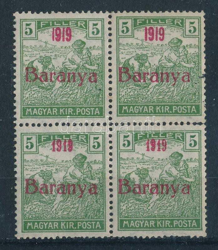 Baranya I. 1919 Arató 5f 4-es tömbben, az alsó két bélyeg antikva évszámokkal, Bodor vizsgálójellel
