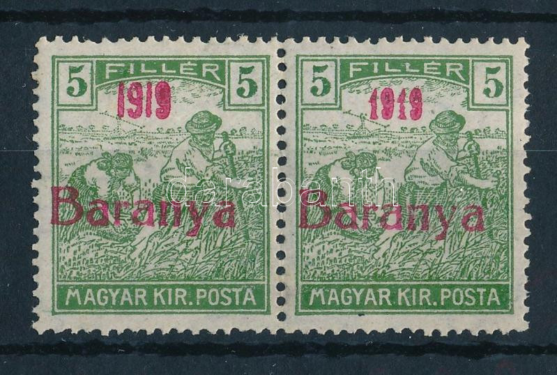 Beschreibung: Baranya I. 1919 Arató 5f pár, a jobb oldali bélyeg antikva évszámmal, Bodor vizsgálójellel