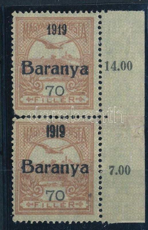 Baranya I. 1919 Turul 70f ívszéli függőleges pár, a felső bélyeg antikva évszámmal, Bodor vizsgálójellel (csak az ívszél tartja össze / aparted perfs.)
