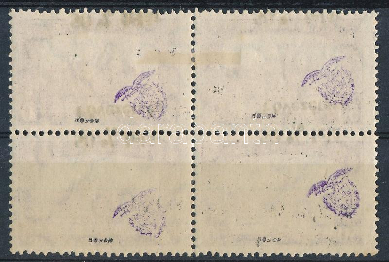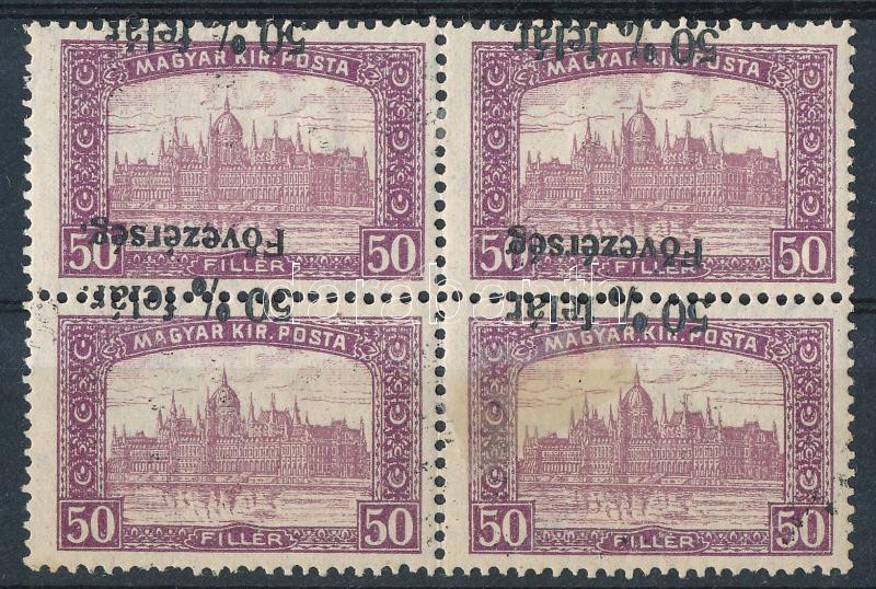 Nyugat-Magyarország III. 1921 Parlament 50f négyestömb kiadásra nem került bélyeg, a hátoldali felirat az előoldalra került, Hadsereg Fővezérség és Bodor vizsgálójellel