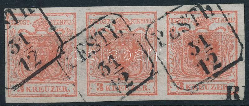 Beschreibung: 1850 3kr HP I hármascsík, kis lemezhibák / stripe of 3 with small plate flaws, quadril paper "PESTH 31/12"