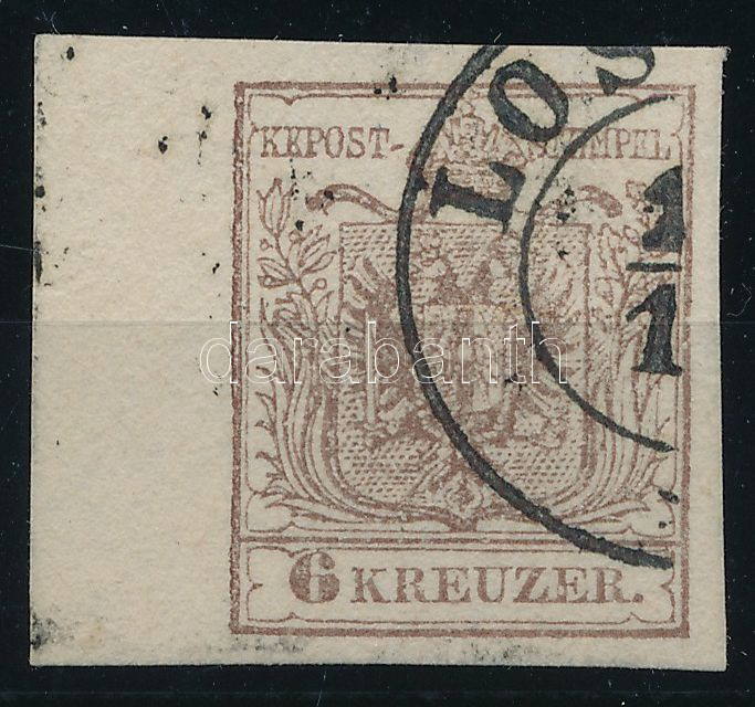 1850 6kr MP III 7,5-8 mm ívszéllel "LOS(ONCZ)" https://www.darabanth.com/de/514-Auktion-Philatelie-Postkarten-Numismatik-Kunstwerke-Bucher-Schreibwaren-Schmuck/515.0/Philatelie-und-Postgeschichte-Ungarn/Briefmarkenausgabe-1850~18/1850-6kr-MP-III-7-5-8-mm-ivszellel-LOSONCZ~II3483114