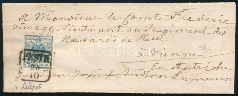 Beschreibung: ~1853 9kr HP III liliputi vágás levélen "PESTH" - "WIEN"