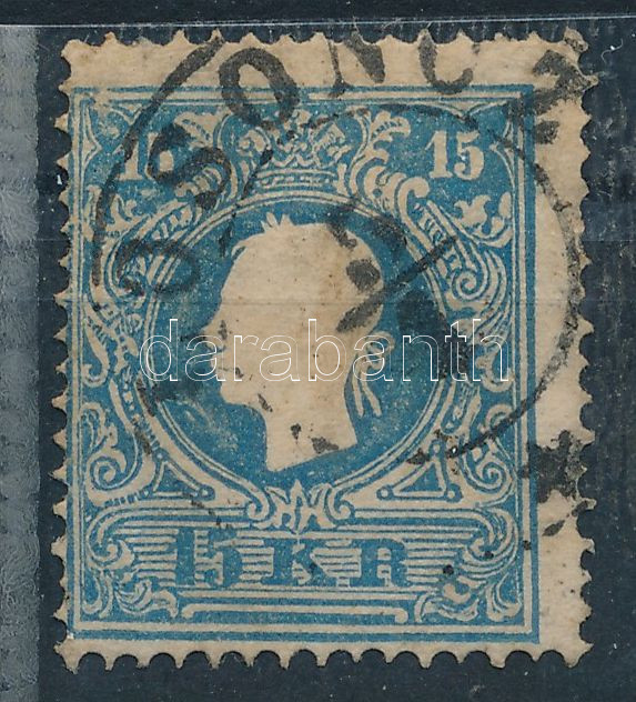 Beschreibung: 1858 15kr II. tipus, lemezhiba: fehér folt a fej alatt "LOSONCZ"