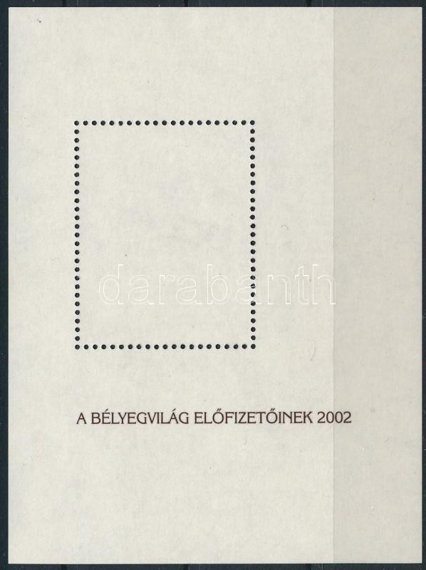 2002 Kossuth Lajos emlékív "A Bélyegvilág előfizetőinek 2002"... https://www.darabanth.com/de/514-Auktion-Philatelie-Postkarten-Numismatik-Kunstwerke-Bucher-Schreibwaren-Schmuck/515.0/Philatelie-und-Postgeschichte-Ungarn/Gedenkbogen~67/2002-Kossuth-Lajos-emlekiv-A-Belyegvilag-elofizetoinek-2002-hatoldali-felirattal~II3475706