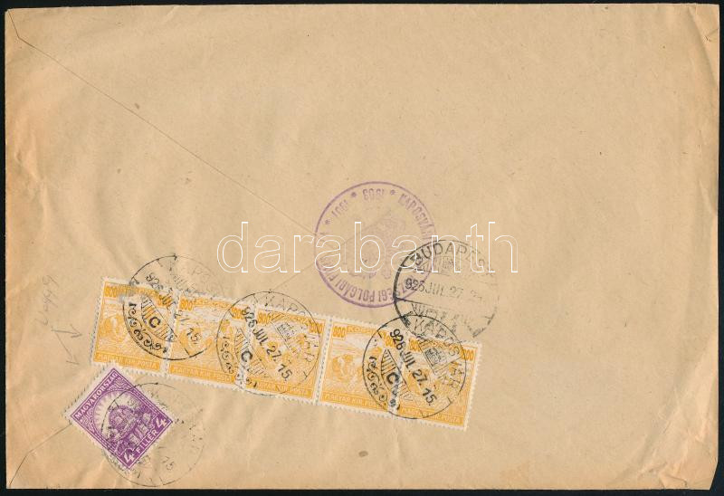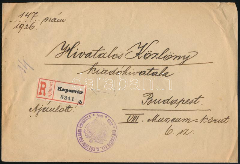 1926 Ajánlott hivatalos levél 800K ötöscsík és 4f vegyes bérmentesítéssel Kaposvárról Budapestre / Registered official cover with mixed franking