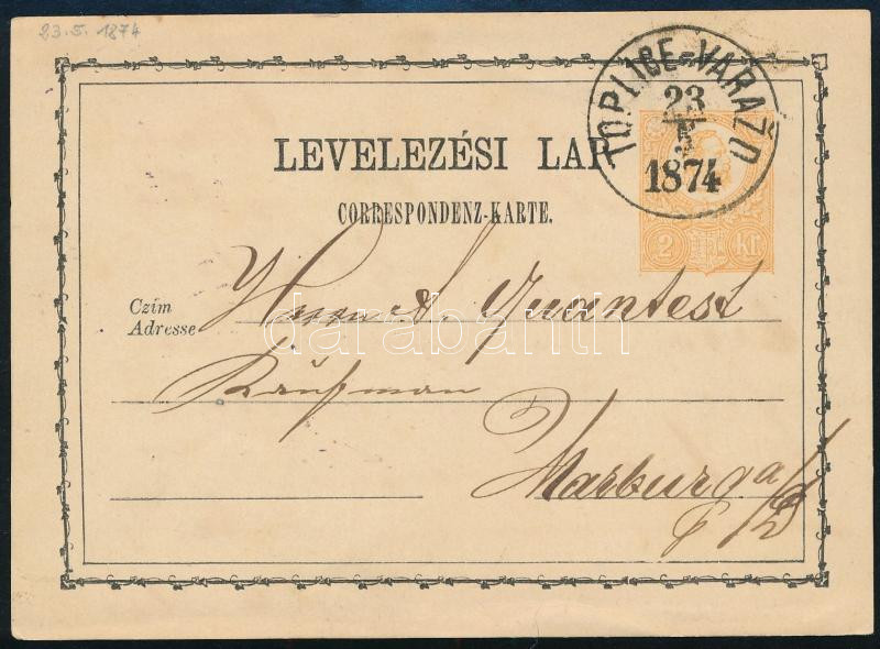 1874 2kr díjjegyes levelezőlap "TOPLICE-VARAZD" https://www.darabanth.com/de/514-Auktion-Philatelie-Postkarten-Numismatik-Kunstwerke-Bucher-Schreibwaren-Schmuck/515.0/Philatelie-und-Postgeschichte-Ungarn/Kupferstich~32/1874-2kr-dijjegyes-levelezolap-TOPLICE-VARAZD~II2885762