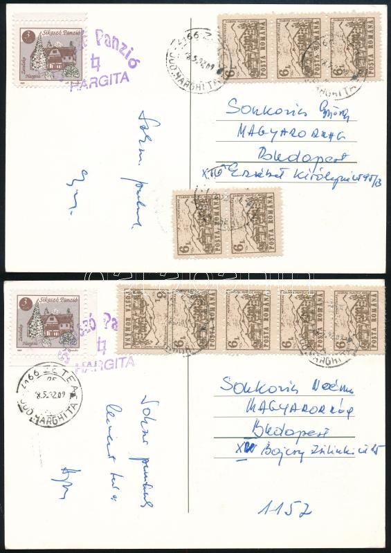 Beschreibung: 1992 2 db Képeslap Erdélyből a Sikaszó panzióból küldve román és magánposta bélyegekkel