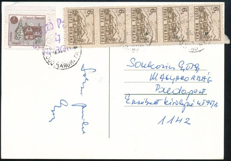 1992 Képeslap Erdélyből a Sikaszó panzióból küldve román és magánposta bélyegekkel