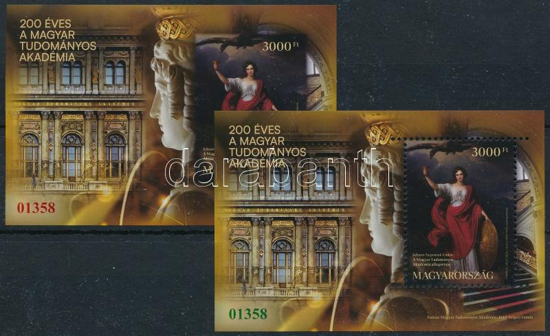 Beschreibung: 2025 200 éves a Magyar Tudományos Akadémia túlfogazott és vágott azonos zöld és piros 01358 sorszámmal
