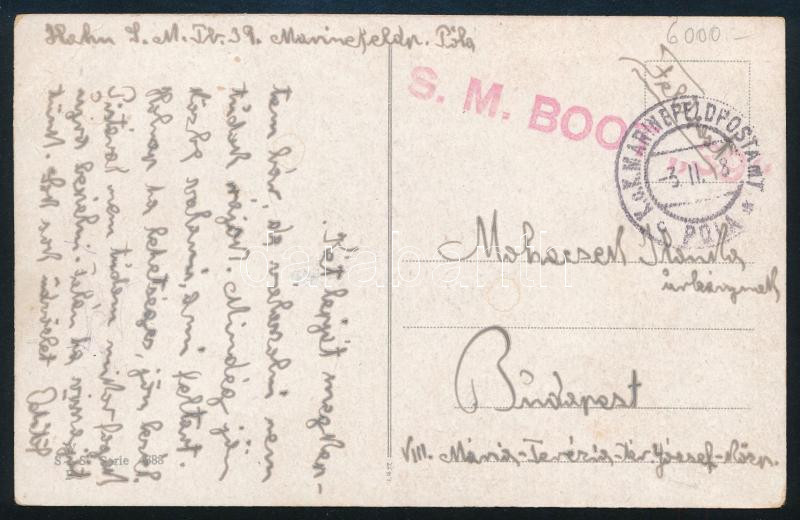1918 Tábori posta képeslap Budapestre küldve / Field postcard, piros / red "S.M. BOOT 39" , "K.u.K. MFP / POLA"