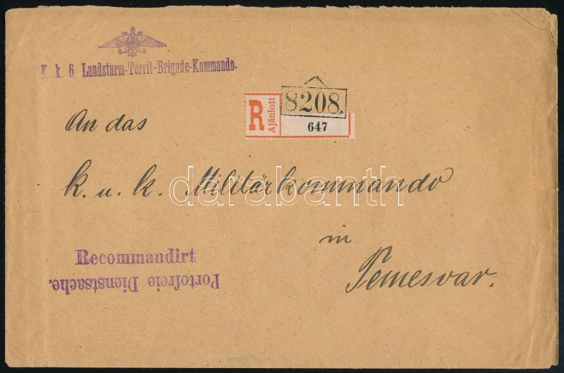 Beschreibung: 1914 Ajánlott tábori küldemény szükségragjeggyel Temesvárra / Registered field post cover with auxiliary label "K.k. 6. Landstrum-Territ-Brigade-Kommando"