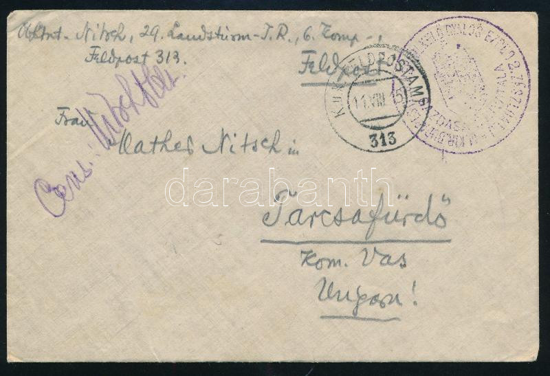 1915 Levél "K.u.K. FP / 313" + "BUDAPEST NÉPFÖLKELŐ GYALOGEZRED" lila bélyegzéssel Tarcsafürdőre