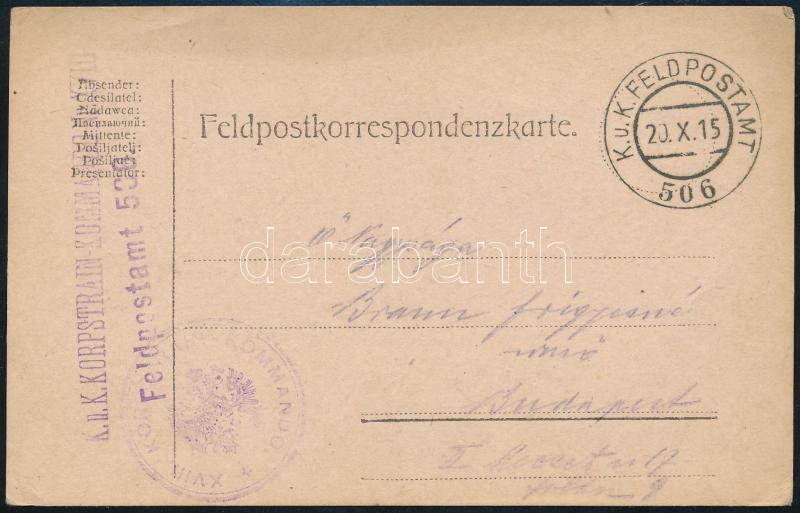 1915 Tábori posta levelezőlap "K.u.K. KORPSTRAIN KOMMANDO" + "FP 506"