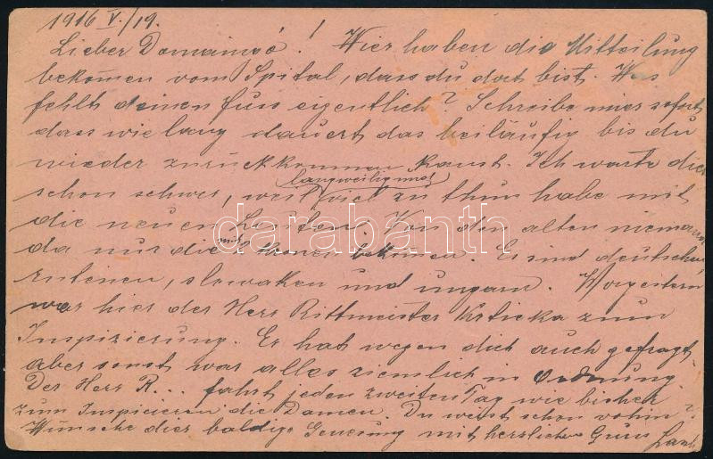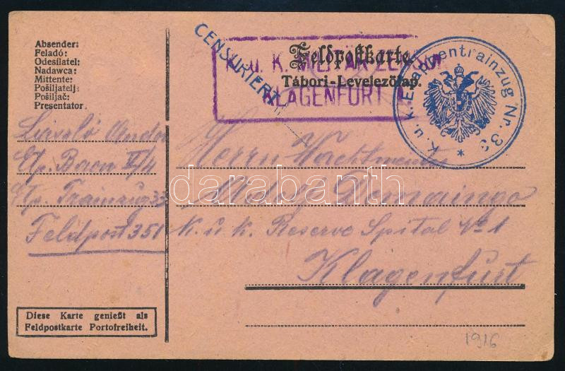 1916 Tábori posta levelezőlap, kék "K.u.k. Etappentrainzug Nr.33" + "K.u.K MILITÄRZENSUR KLAGENFURT"