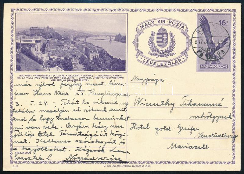 Beschreibung: 1937 16f díjjegyes levelezőlap