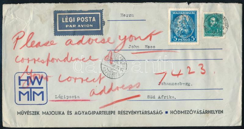 1937 Légi levél 2 db bélyeggel Dél-Afrikába / Airmail cover to South A... https://www.darabanth.com/de/514-Auktion-Philatelie-Postkarten-Numismatik-Kunstwerke-Bucher-Schreibwaren-Schmuck/515.0/Philatelie-und-Postgeschichte-Ungarn/Pengo-Periode-1926-1944~53/1937-Legi-level-2-db-belyeggel-Del-Afrikaba-Airmail-cover-to-South-Africa~II3413293