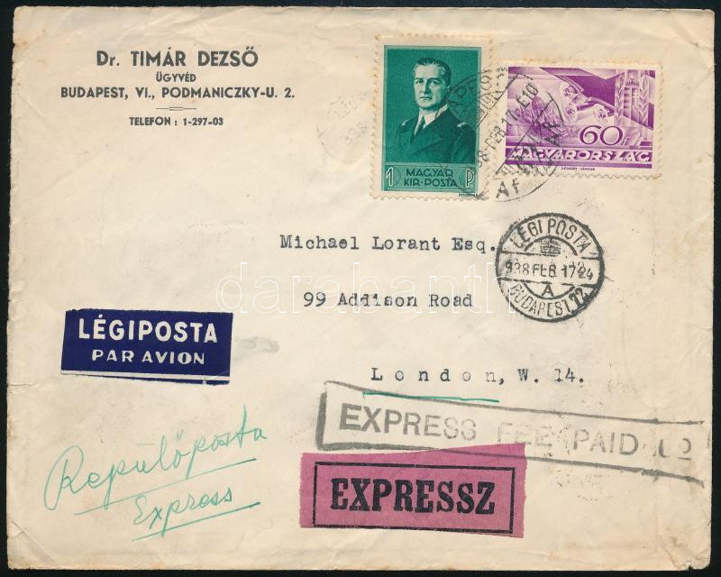 1938 Expressz légi levél Londonba / Express airmail cover to London https://www.darabanth.com/de/514-Auktion-Philatelie-Postkarten-Numismatik-Kunstwerke-Bucher-Schreibwaren-Schmuck/515.0/Philatelie-und-Postgeschichte-Ungarn/Pengo-Periode-1926-1944~53/1938-Expressz-legi-level-Londonba-Express-airmail-cover-to-London~II3449289