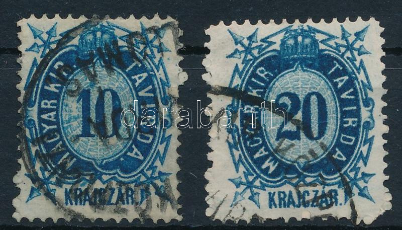 Beschreibung: 1874 Réznyomat távírda 10kr + 20kr, az egyik keskenyre, a másik szélesre fogazva (bepattanások / perf. flaws)