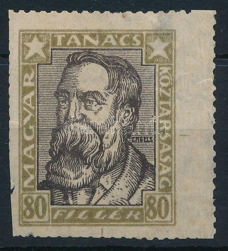 1919 Magyar Tanácsköztársasági arcképek 80f elfogazva, foghiány (kis s... https://www.darabanth.com/de/514-Auktion-Philatelie-Postkarten-Numismatik-Kunstwerke-Bucher-Schreibwaren-Schmuck/515.0/Philatelie-und-Postgeschichte-Ungarn/Ungarische-Raterepublik~49/1919-Magyar-Tanacskoztarsasagi-arckepek-80f-elfogazva-foghiany-kis-serules~II3479910