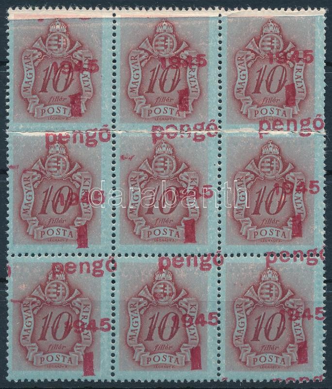 1945 Kisegítő portó 1P/10f 9-es tömb látványosan elcsúszott felülnyomással, alapnyomat elcsúszással, ráncokkal / Mi Postage due 174 block of 9 with shifted overprint and burelage, creases