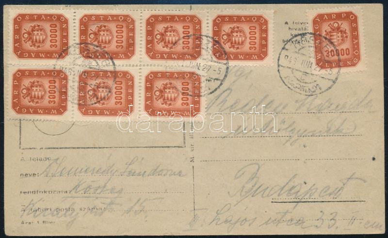 1946 (21. díjszabás) Távolsági levelezőlap 8 x 30000 Milpengő csíramentesítéssel "KŐSZEG" - Budapest