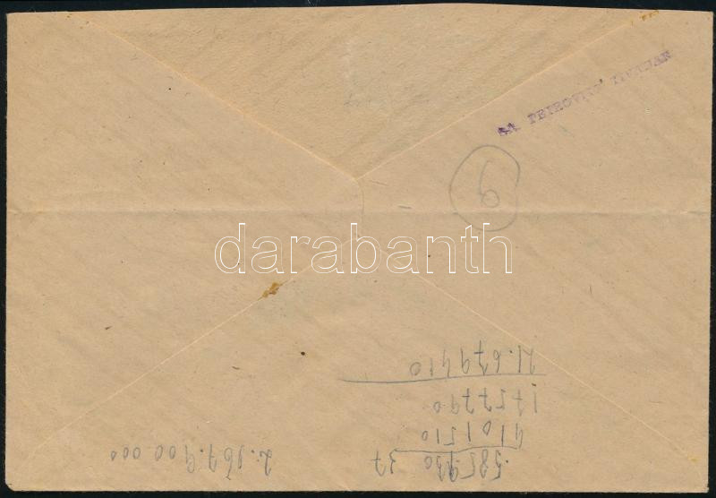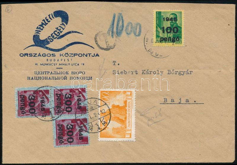 1946 (5. díjszabás) Távolsági levél 100P bérmentesítéssel Budapestről Bajára, portózva 1000P értékben