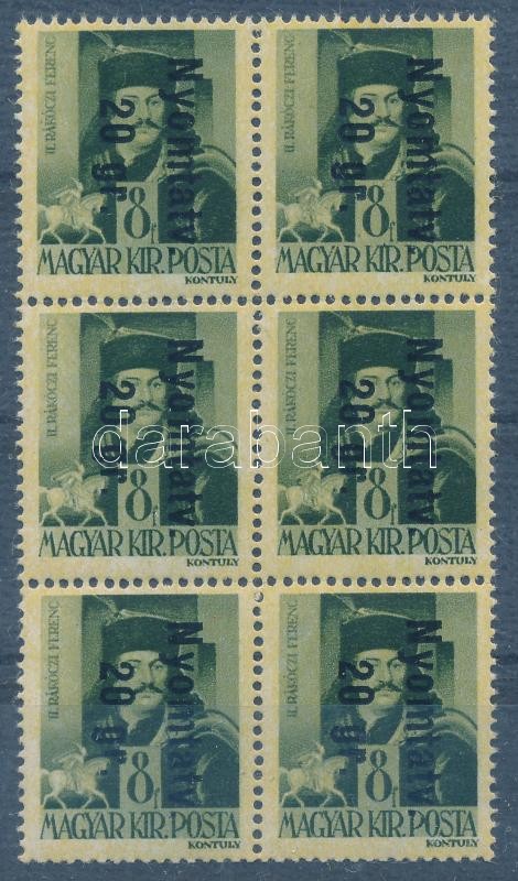 1946 Betűs III. Nyomtatv.20gr. / 60f / 8f hatostömb, az első piros 60f felülnyomás hiányával, de annak halvány színátnyomatával / Mi 870 block of 6 with missing red 60f overprint, with light red offset. Certificate: Glatz