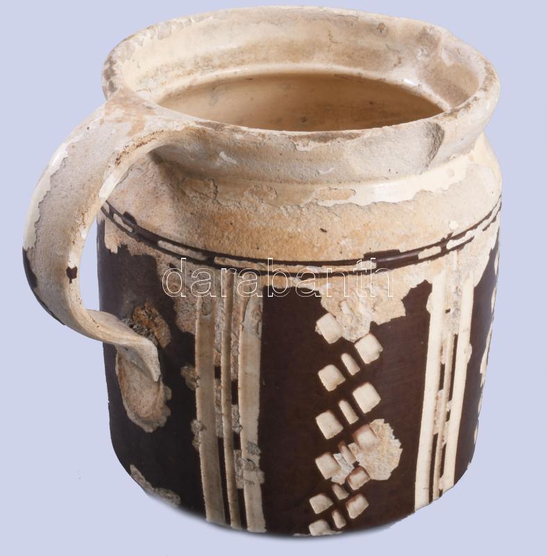 Kiöntő. Mázas cserép XIX. sz. kézzel festett, sérült kaparásos technik... https://www.darabanth.com/de/514-Auktion-Philatelie-Postkarten-Numismatik-Kunstwerke-Bucher-Schreibwaren-Schmuck/515.0/Porzellan-Keramik-Glass/Keramiken~571/Kionto-Mazas-cserep-XIX-sz-kezzel-festett-serult-kaparasos-technikaval-keszult-13-cm~II3478789