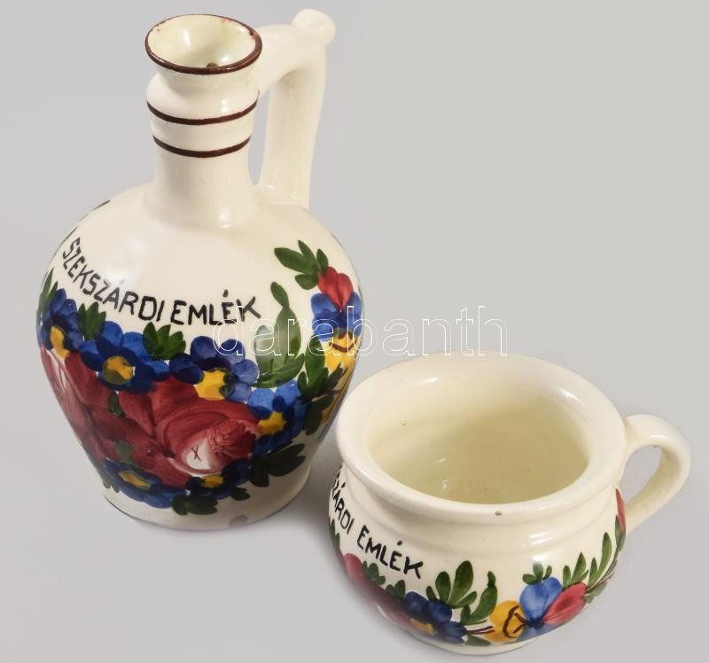 Beschreibung: Városlődi kerámia "Szekszárdi emlék" feliratú mázas kerámia mini korsó és edény jelzett, d: 5, 13 cm