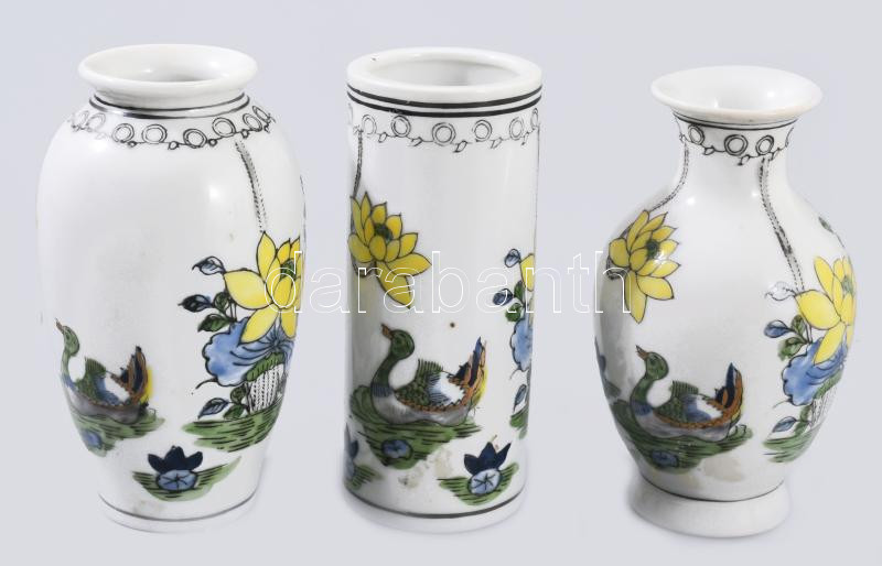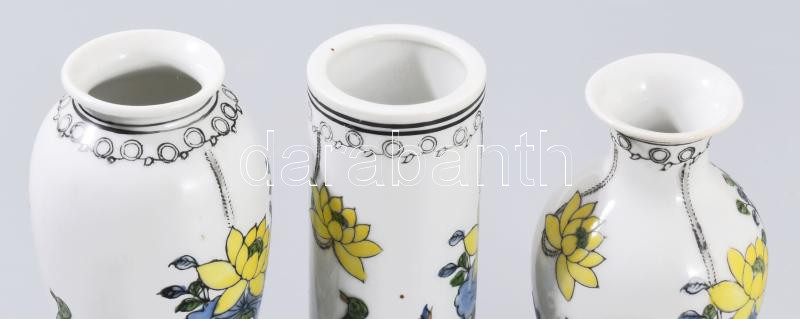 Beschreibung: 3 darabos kínai kisváza szett, cca 20. sz középső harmada, jelzett, kézzel festett, hibátlan, m: 10 cm