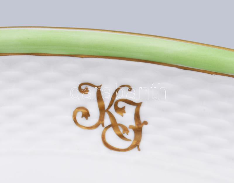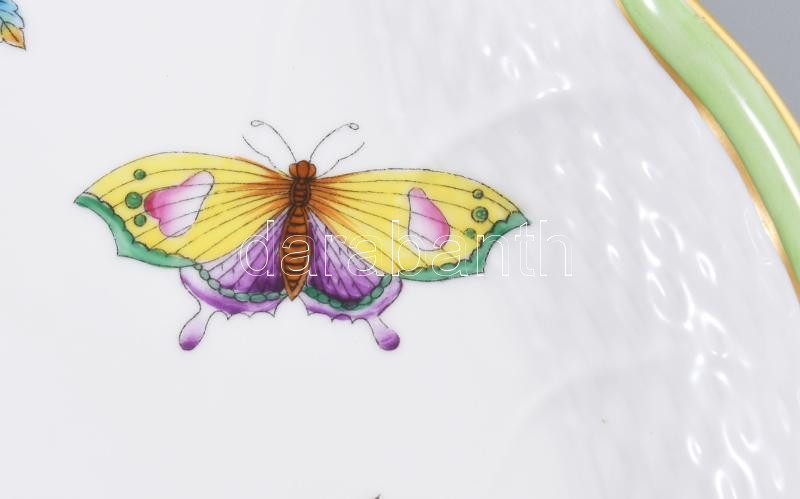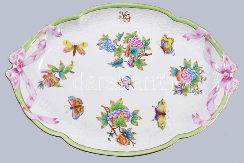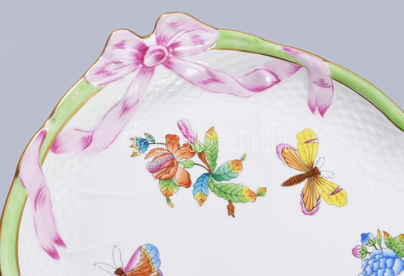 Beschreibung: Herendi Viktória mintás gazdagon díszített ovális kínáló, masnis lezárással, jelzett, hibátlan, 42x29 cm