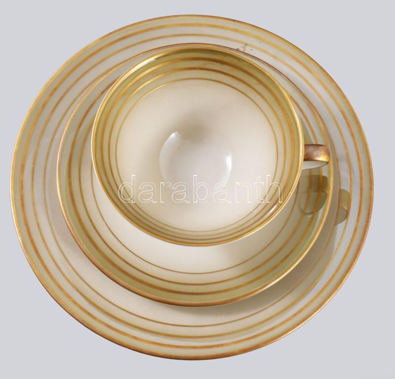 Beschreibung: Scherzer mid-century egyszemélyes reggeliző készlet, csésze alátéttel és desszertes tányér. Jelzett, hibátlan, d: 19,5 cm