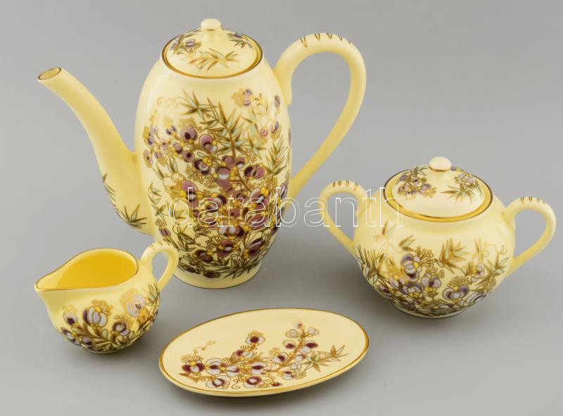 Beschreibung: Zsolnay bambuszmintás 6 személyes kávés készlet, jelzett, teljes, egyik csészén repedésvonallal, cukortartó teteje ragasztott, mázrepedésekkel, díszdobozban, leírással.
