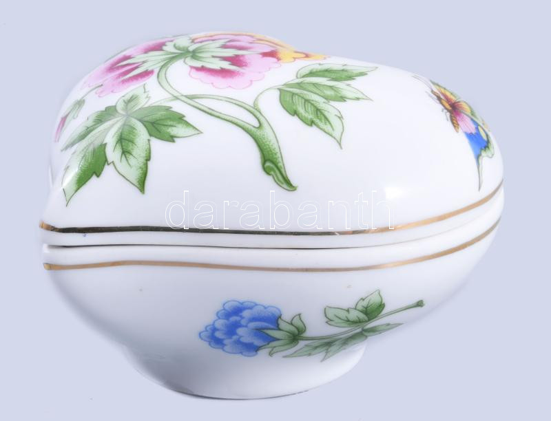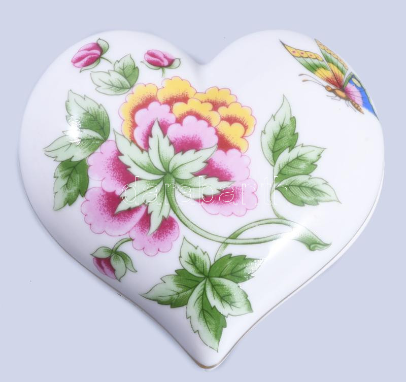 Beschreibung: hollóházi hortenzia mintás szív alakú bonbonier, jelzett, hibátlan, 10x10 cm