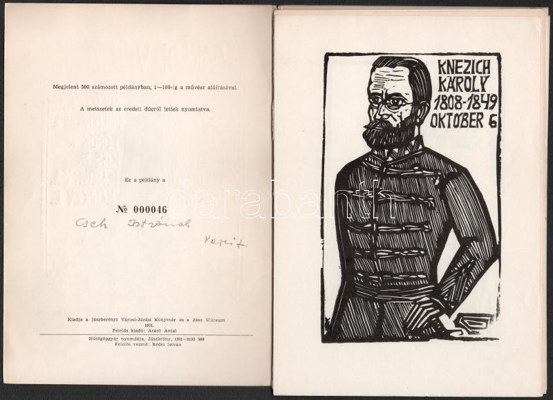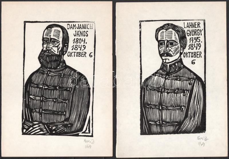 Perei Zoltán (1913-1992): Aradi vértanúk. 13 db fametszet külön lapokon, papír. Kiadói papírmappában, mappa belső borítóján számozott (46/100) és Perei Zoltán autográf ajánlásával. Készült 500 számozott pédányban, 1-100-ig a művész aláírásával. 2 db lap ceruzával jelzett, többi jelzés nélkül. Jászberényi Városi-Járási Könyvtár és a Jász Múzeum kiadása, 1981. Borítón apró folttal, máskülönben jó állapotban. Lapméret: 21x15 cm